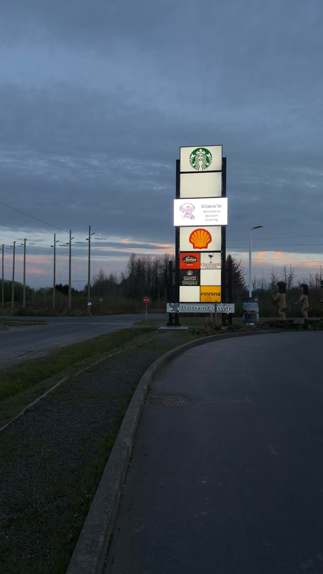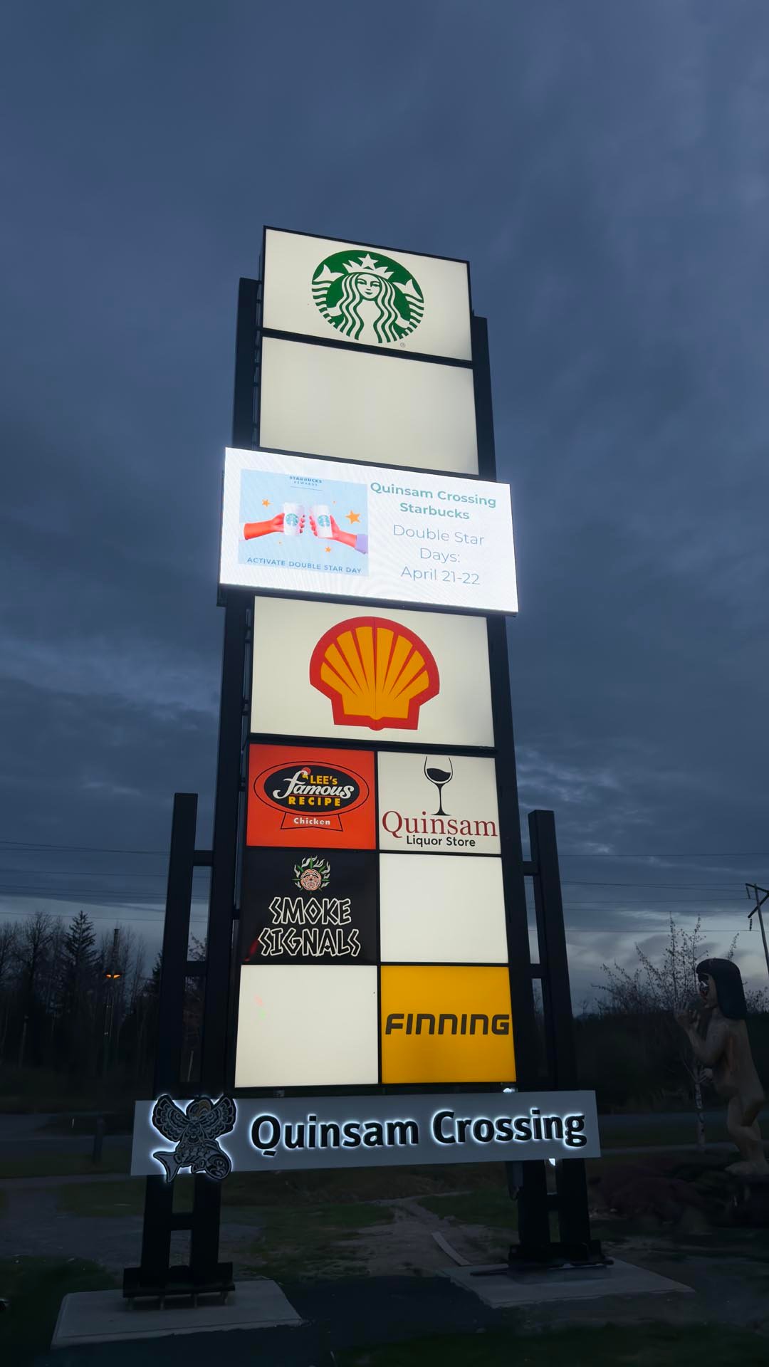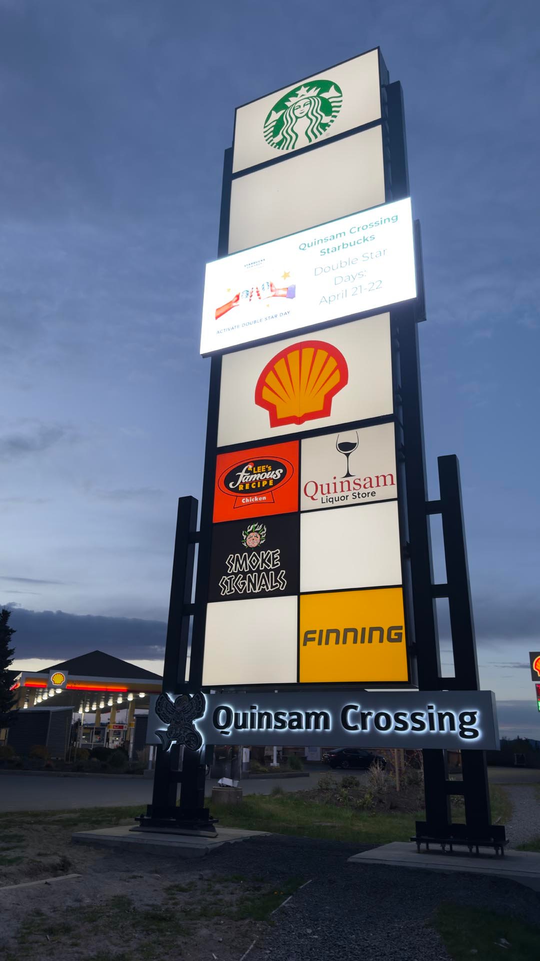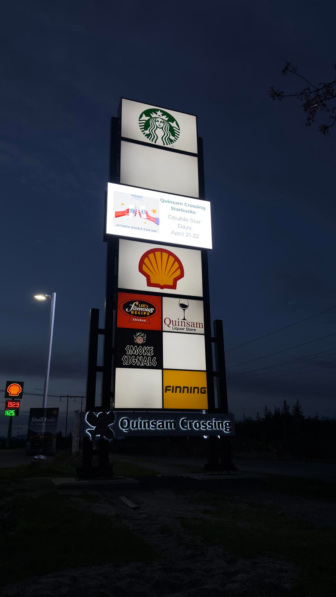 At the base of the structure, reverse-lit channel letters spelling “Quinsam Crossing” were installed as a permanent feature, acting as the main header and identity for the development. These letters provide a clean, consistent brand presence while the tenant panels above remain flexible and changeable.