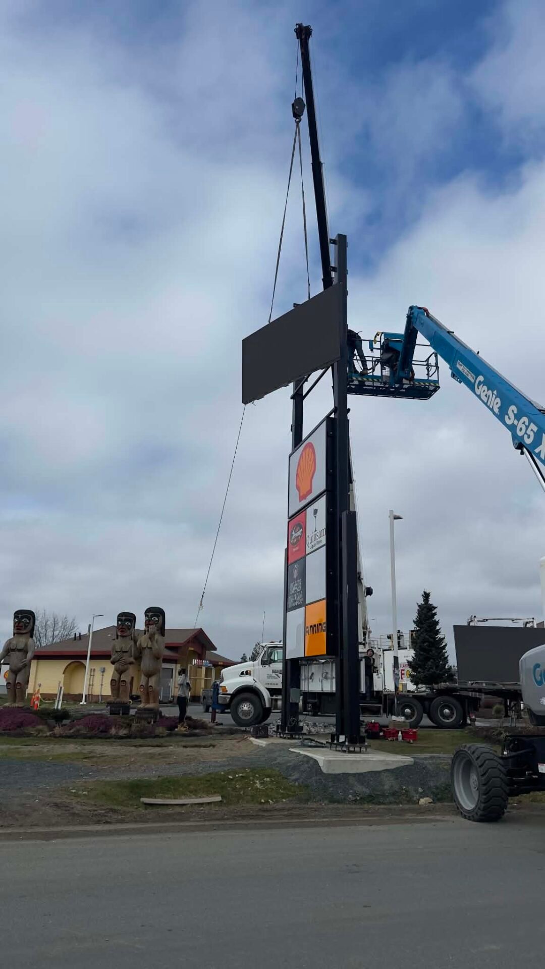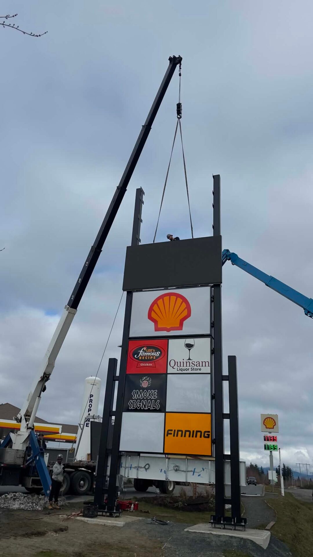 On-site, we coordinated crane access, lift planning, and installation sequencing to ensure a smooth and controlled setup. Structural components were lifted and set first, followed by the sign cabinets and electronic message center assemblies. Every lift was executed with precision, using engineered lift points and custom brackets to ensure proper balance and alignment.