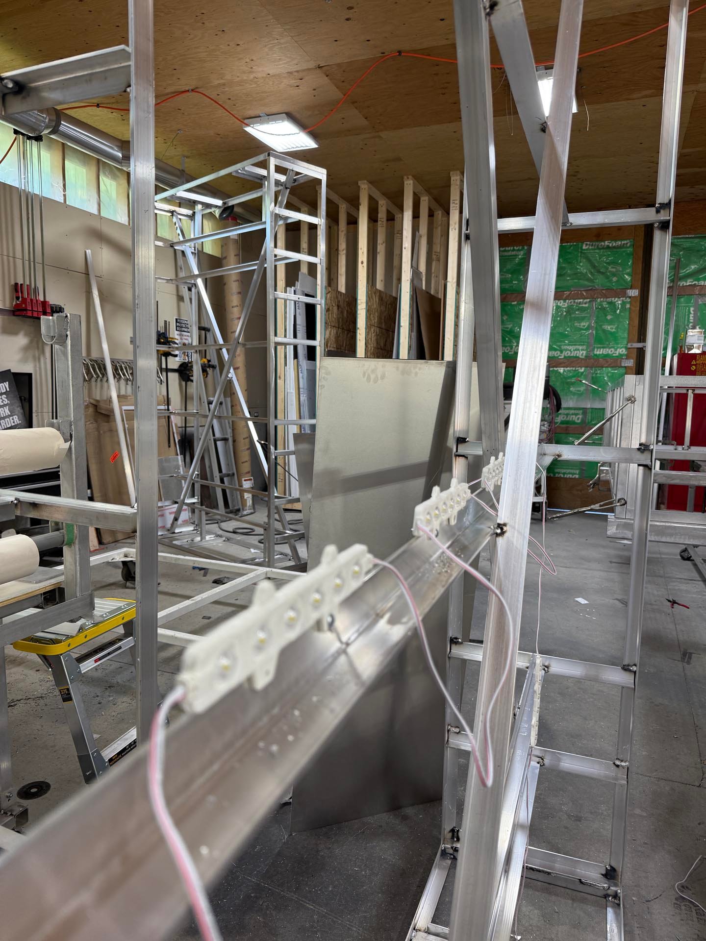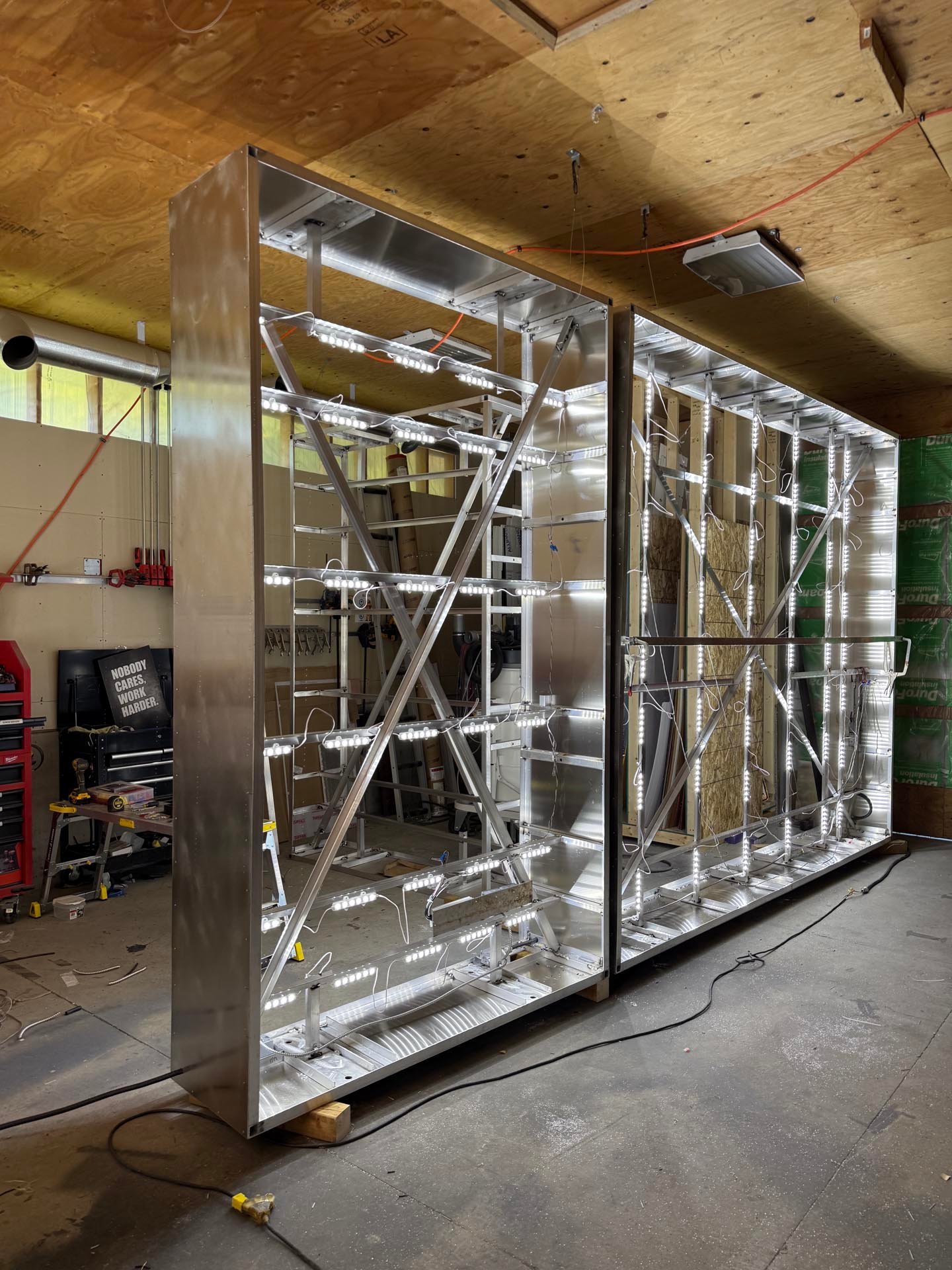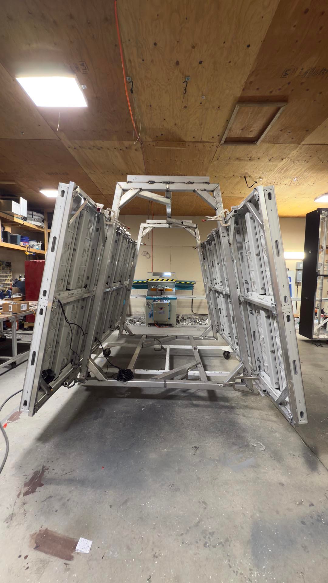 To support this, we fabricated custom aluminum brackets and built a specialized A-frame structure to safely assemble the units. Each side required a precision-built frame to support eight 3’ x 3’ LED panels, all mounted and secured from the rear.